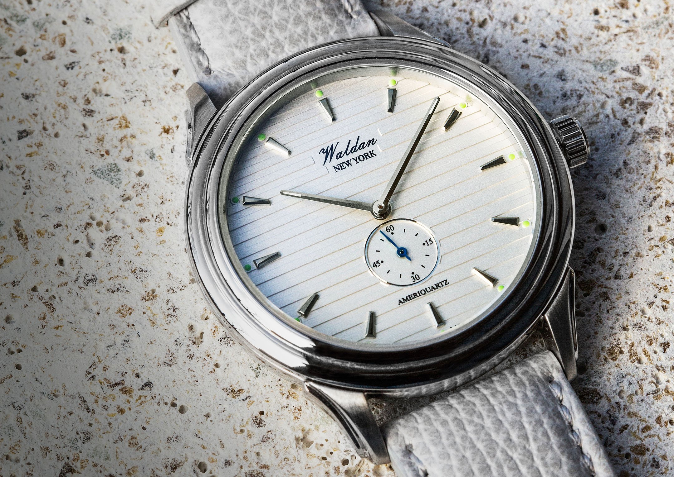Silvered White oil pressed linear style dial with applied steel baton numerals, steel hands with superluminova treated luminous tips, applied superluminova lume plots on the outer rim of dial. Sunken and diamond cut subdial above 6pm for sub seconds register with small blue steel hand.. Signed “Waldan, New York”, “AMERIQUARTZ” and “USA MOVT”.