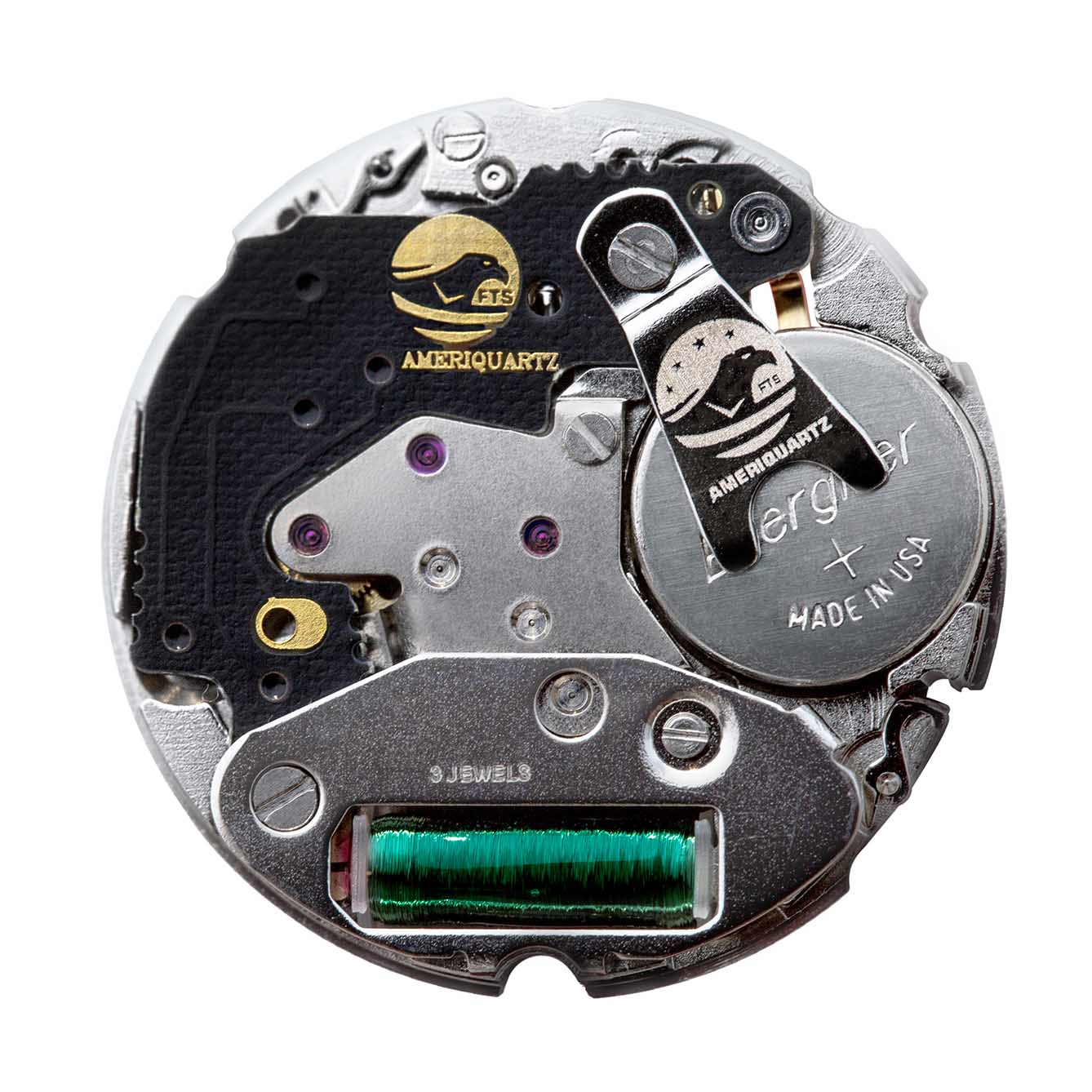 A quartz movement at the forefront of innovation, the cal. 70200 is an American Made quartz movement, uniquely made of robustly machined metal components. Each movement is hand assembled and tested in the United States and is also fully serviceable. The cal. 70200 is designed with key advances to the construction of the movement, such as jeweled bearings which provide minimized friction as well as better capillary attraction of the oils - which results in a longer service and shelf life. Use of SMD (Surface Mounted Device) technology in the ECB (Electronic Circuit Board) provides higher efficiency and a smaller physical footprint inside the movement as well. Warrantied for 5 years.