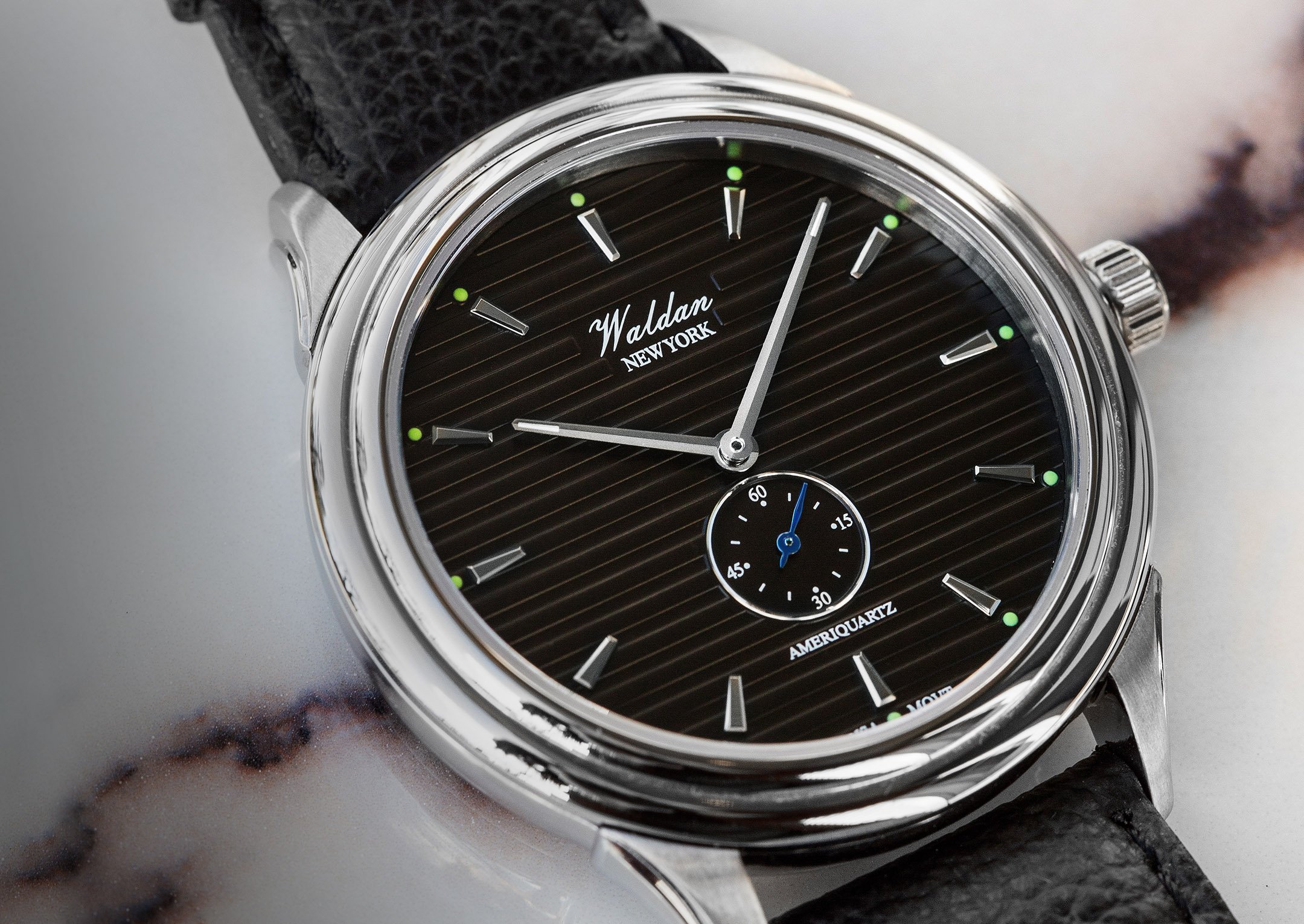 Jet Black oil pressed linear style dial with applied steel baton numerals, steel hands with superluminova treated luminous tips, applied superluminova lume plots on the outer rim of dial. Sunken and diamond cut subdial above 6pm for sub seconds register with small blue steel hand. Signed “Waldan, New York”, “AMERIQUARTZ” and “USA MOVT”.
