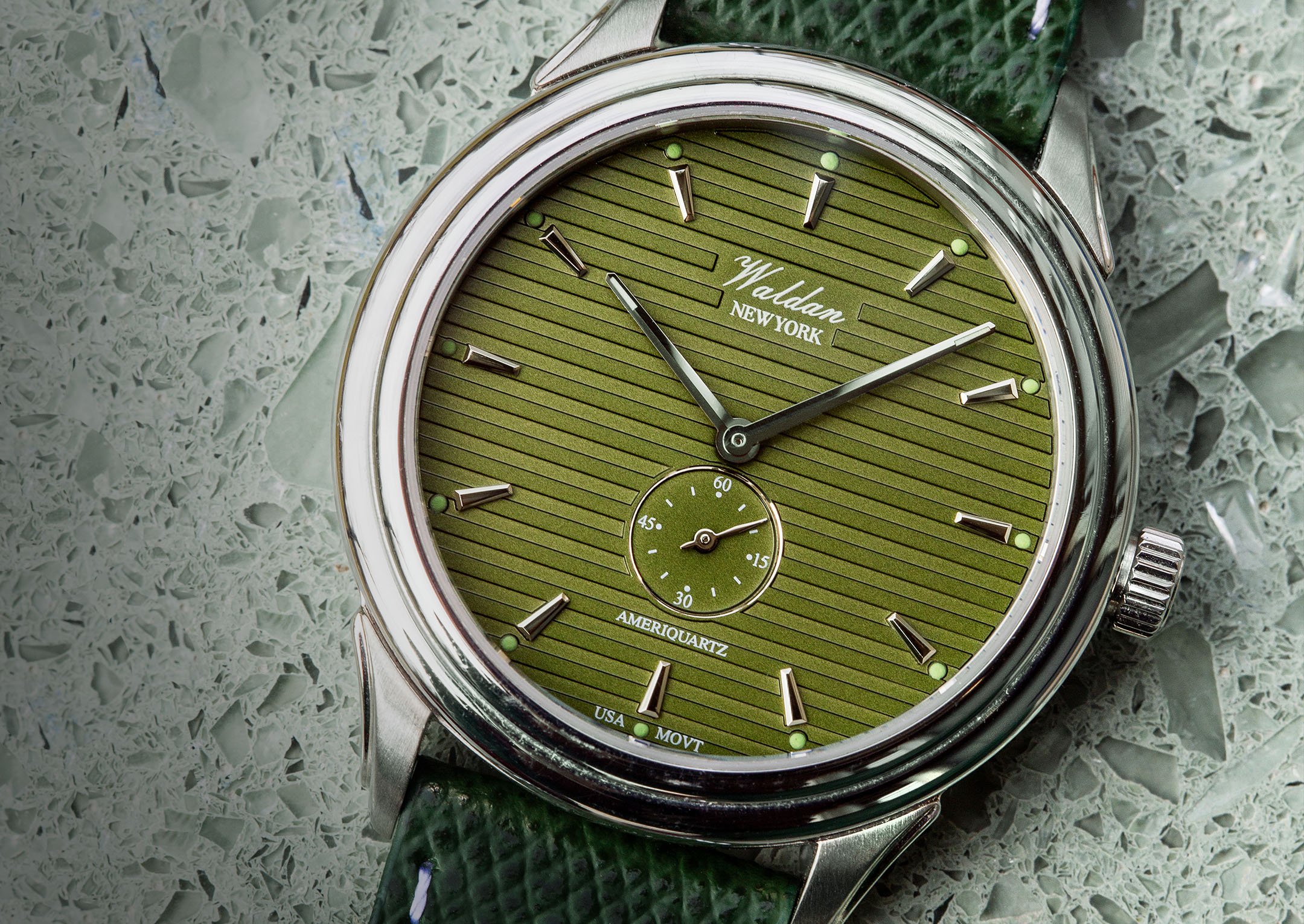 Olive Khaki oil pressed linear style dial with applied steel baton numerals, steel hands with superluminova treated luminous tips, applied superluminova lume plots on the outer rim of dial. Sunken and diamond cut subdial above 6pm for sub seconds register with a small steel hand.. Signed “Waldan, New York”, “AMERIQUARTZ” and “USA MOVT”.