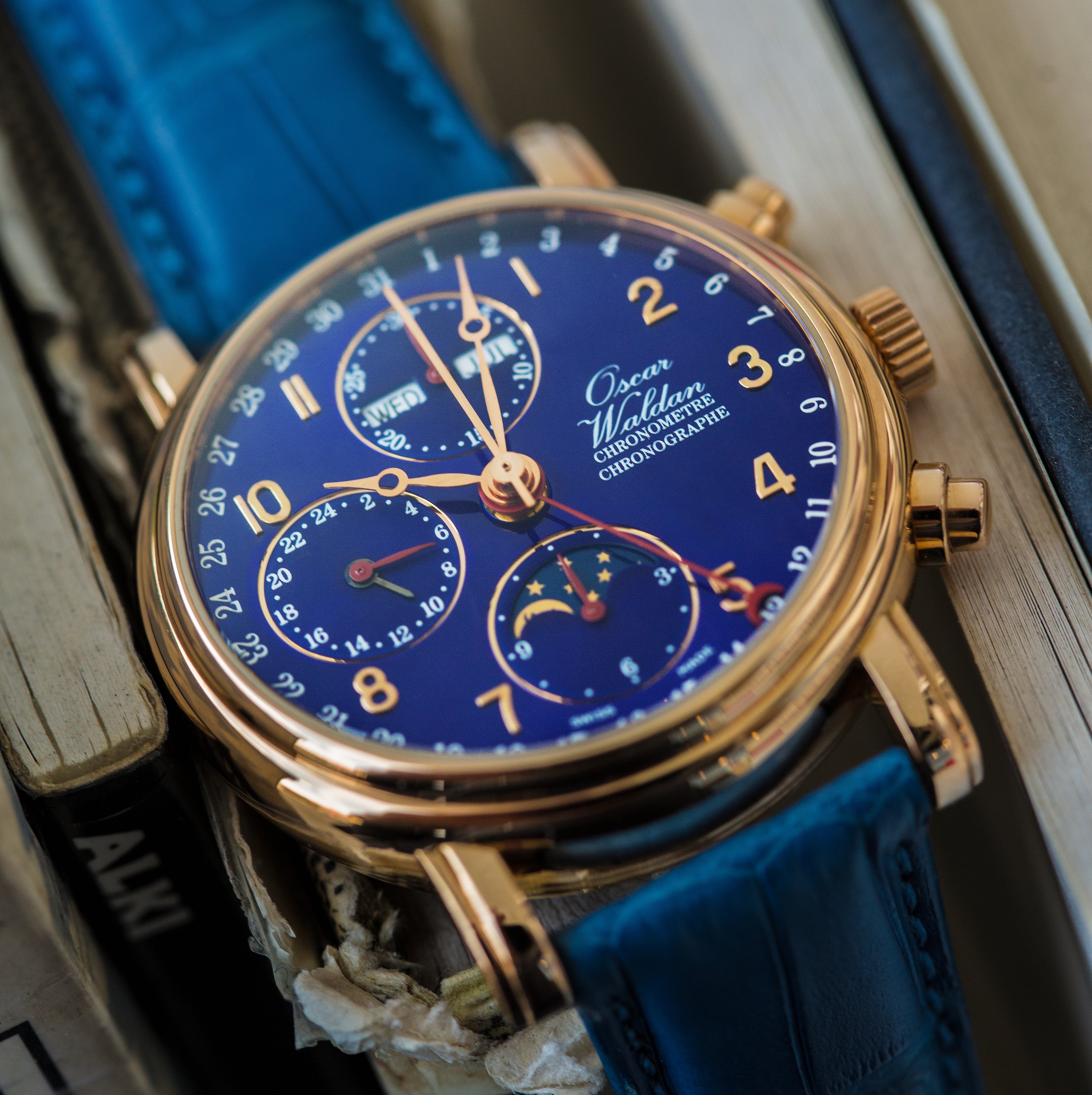 Cobalt blue enamel dial with rose gold applied Arabic style markers, gold Breguet hands and gold chronograph sweep seconds hand. 3 gold trimmed and sunken subdials feature a 30-minute register, day of the week and month apertures at 12; hour register and rotating moon phase at 6 and second hand and 24h time indicator at 9. Date is printed on the track on the outer rim of the dial. Waldan signature at 3.