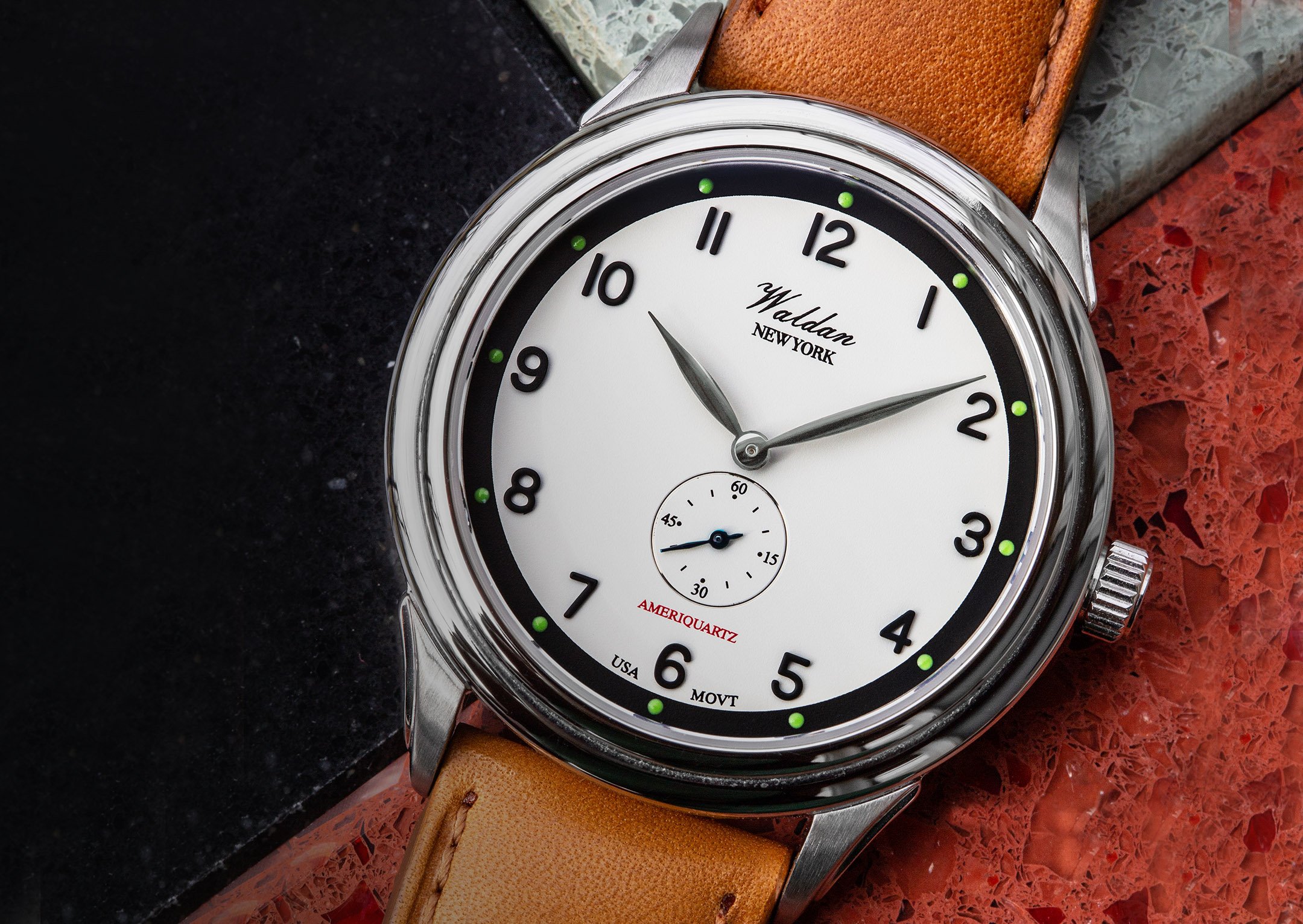 Off White (OA variant) dial with black applied arabic numerals, steel hands, black outer dial rim with applied superluminova lume plots. Sunken and diamond cut subdial above 6pm for sub seconds Movement Size 8 3/4” (19.40mm) register with small blue steel hand. Signed “Waldan, New York”, “AMERIQUARTZ” and “USA MOVT”.